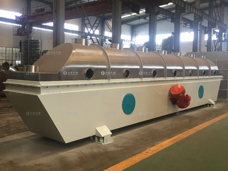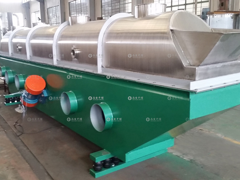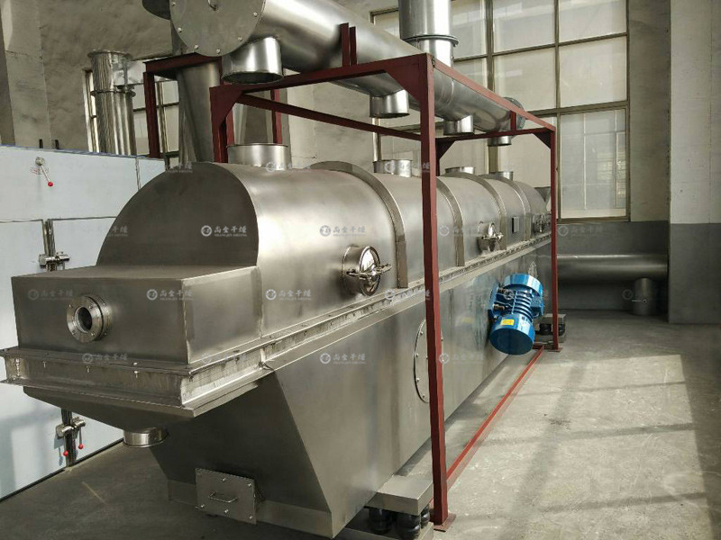 物料自進(jìn)料進(jìn)口進(jìn)入機(jī)內(nèi),在振動(dòng)力作用下,物料沿水平面流化床拋擲,向前連續(xù)運(yùn)動(dòng),熱風(fēng)向上穿過流化床同濕物料換熱后,濕空氣經(jīng)旋風(fēng)分離器除塵后由排風(fēng)1:3排出,干燥物料由排料進(jìn)口排出。
