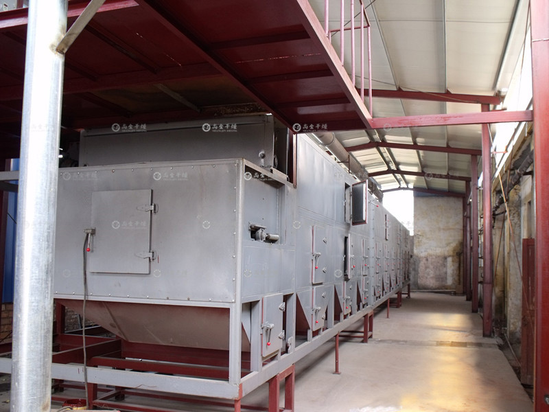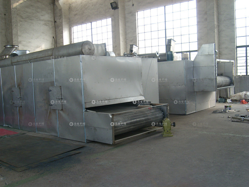 物料由加料器均勻地鋪在網帶上,網帶一般采用12-60目不銹鋼絲網,由傳動裝置拖動在干燥機內移動。干燥機由若干單元組成,每一單元熱風獨立循環(huán),部分尾氣由專門排濕風機排出,廢氣由調節(jié)閥控制,熱氣由下往上或由上往下穿過鋪滿物料的網帶完成熱量與質量傳遞的進程,帶走物料水份。網帶緩慢移動,運行速度可根據(jù)物料溫度自由調節(jié),干燥后的成品連續(xù)落入收料器中。上下循環(huán)單元根據(jù)用戶需要可靈活配備,單元數(shù)量亦可根據(jù)需要選取。