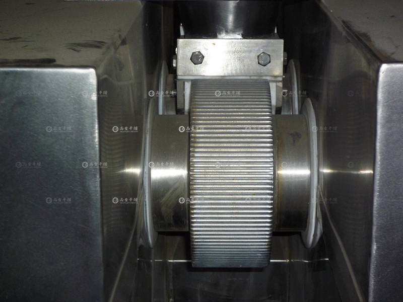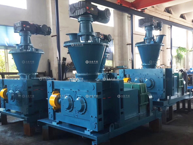 擠壓造粒的形式可以有對(duì)輥式和輪輾式兩種,對(duì)輥式擠壓是先壓成大塊,再破碎成顆粒,這樣裝置的能力大、顆粒強(qiáng)度高、能耗低,對(duì)輥擠壓在國(guó)外使用廣泛。輪輾式是在輥表面直接做成有穴槽型的形狀,一次擠成成型顆粒。產(chǎn)品強(qiáng)度較低有時(shí)需添加粘結(jié)劑。適合做有機(jī)肥和復(fù)合肥等顆粒肥料。