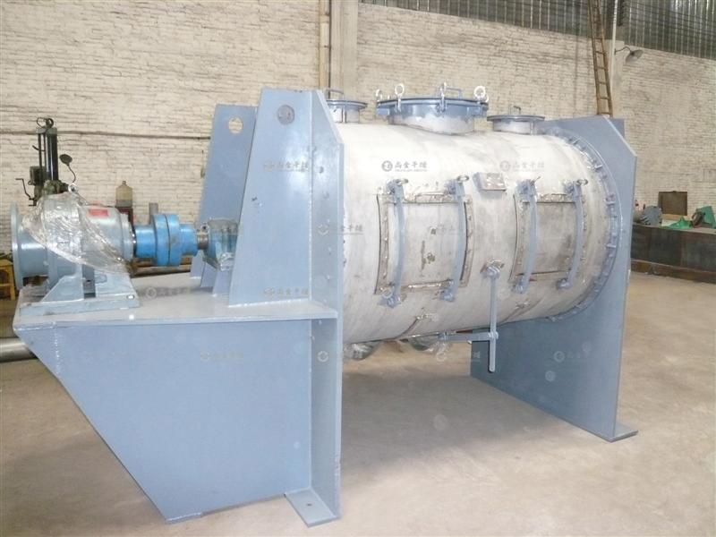 該機(jī)型由傳動(dòng)機(jī)構(gòu)、臥式筒體、犁刀、飛刀四部分組成,物料在犁刀作用下沿筒壁作軸向流支,當(dāng)物料流經(jīng)飛刀時(shí)被高速度旋轉(zhuǎn)的飛刀拋灑,從而在較短時(shí)間內(nèi)達(dá)到均勻混合。